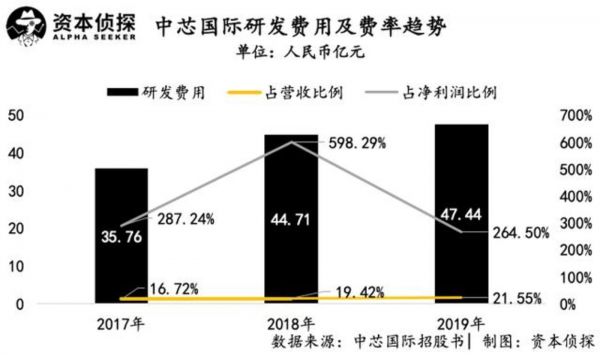 半导体行业是出了名的高门槛,需要投入大量研发,这一点在中芯国际上同样体现明显。招股书显示,2017-2019年,中芯国际的研发费用分别为35.76亿元、44.71亿元、47.44亿元,占同期营业收入的比例分别为16.72%、19.42%、21.55%,且占同期净利润的比例分别为287.24%、598.29%、264.5%。