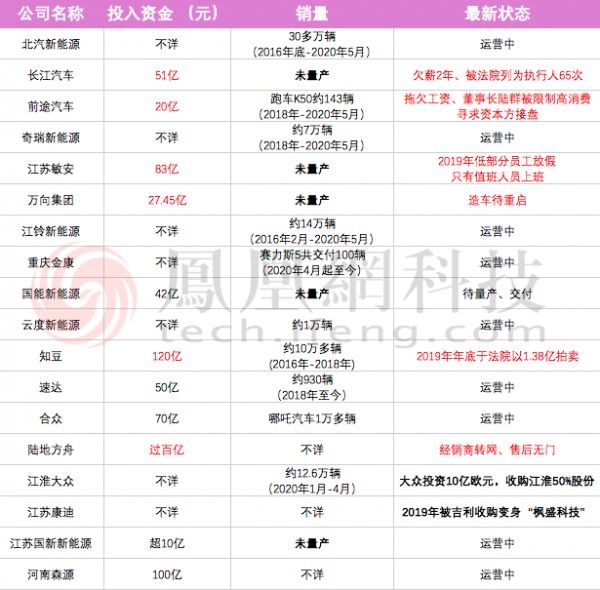 就连获得了发改委生产资质的18家厂商,目前至少有5家公司没能实现量产,多家公司在2018年后也陆续爆出欠薪裁员、被拍卖或收购。这些拿到资质的厂商还并非完全没有造车的经验,大多在传统汽车领域摸爬滚打多年,投入都上十几亿、甚至上百亿。