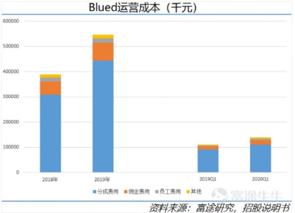 据富途研究,2019年Blued的直播付费用户数量为32.6万人,而当年公司直播营收为6.71亿元,平均每个付费用户贡献2059元,用户质量可谓之高。但是由于分成费用的存在,直接损耗了公司的盈利水平。这分成费用其实就是,Blued给主播经纪公司的利润分成。