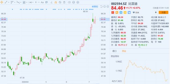但比亚迪在资本市场受到的追捧不减,3月底发布刀片电池至今,累计涨幅达75%,至今日的84.46元,市值超过2304亿元。