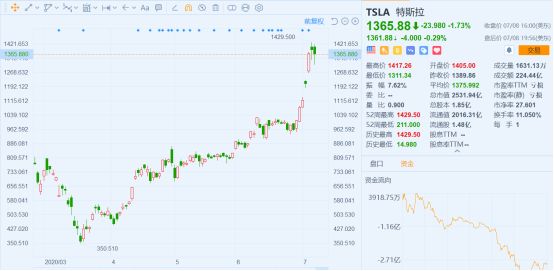 国际市场上,特斯拉在7月2日公布了第二季度销售数据,数据显示特斯拉第二季度工交付汽车9万余辆,虽然同比减少了4.9%,但远远超过此前分析师预估的8万辆。优异的销售数据拉开了特斯拉暴涨的帷幕。至昨天收盘的1389.86美元,特斯拉一周内累计上涨37.7%,7月7日当天市值甚至“涨出一个福特”。