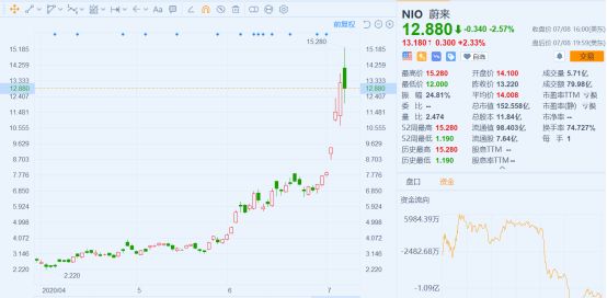 中概股造车新势力蔚来也在最近公布了第二季度的交付数据。今年6月,蔚来共交付了汽车3740辆汽车,同比增长了179.1%。受特斯拉概念的影响,加上亮眼的销售数据,蔚来股价也自6月起直线攀升,一周累计涨幅超66%。6月至今股价翻了2.2倍,市值增长超过58亿美元至152.5亿美元。