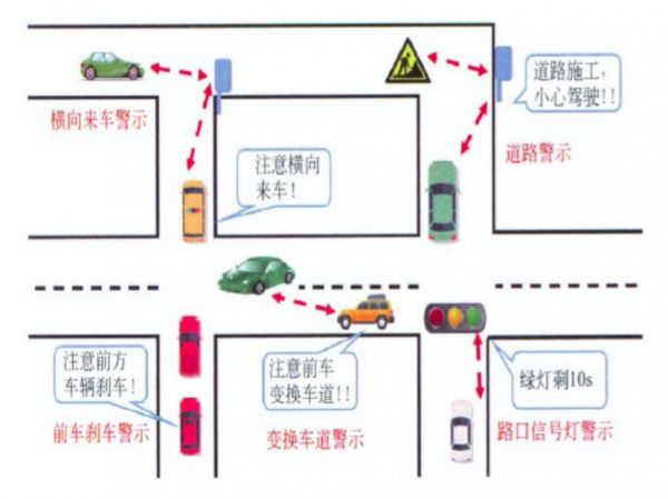 举个例子,当马路转角有车驶出,或是前方车辆突然急刹以及变换车道时,车内的信号装置会以闪烁、语音提示等方式提醒驾驶员注意。