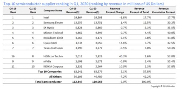 拥有自建的晶圆厂,还在CPU方面在市场上占据绝对性的竞争力,这也让英特尔在这个领域一骑绝尘。据知名市场研究机构IC Insights发文预计,2020年全球芯片出货量将再次超过1万亿颗,是半导体行业有史以来第二次出货超过1万亿颗。正因为芯片出货量表现好于预期,根据市场研究机构Omdia今日公布全球Q1半导体排行榜,英特尔超过三星、SK霸占第一营收的位置。