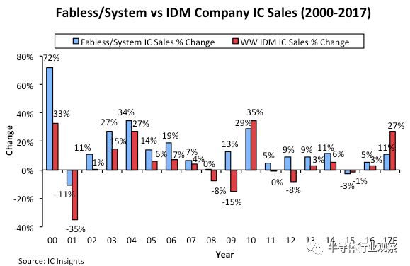 根据下图来看,自2000年以来,大部分情况都是Fabless的表现要好于IDM。而在台积电成立之后,全球半导体世界开始分工形式,在代工模式的助推下,这也让英伟达、博通、高通等安心研发芯片,辅助他们在不同领域成为芯片巨头。