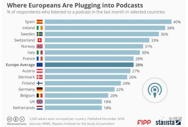 欧洲播客广告基础设施的建设并非易事。欧洲有46个国家,各国使用的语言不尽相同。受众群体希望播客使用本地语言,但单一语言却会限制广告收入的可延展性。根据WARC和路透社2018年12月的研究:就听众比例而言,欧洲的大型播客市场通常是其语言在全球范围内被广泛使用的国家,例如西班牙、爱尔兰、瑞士、法国和使用英语的北欧国家。