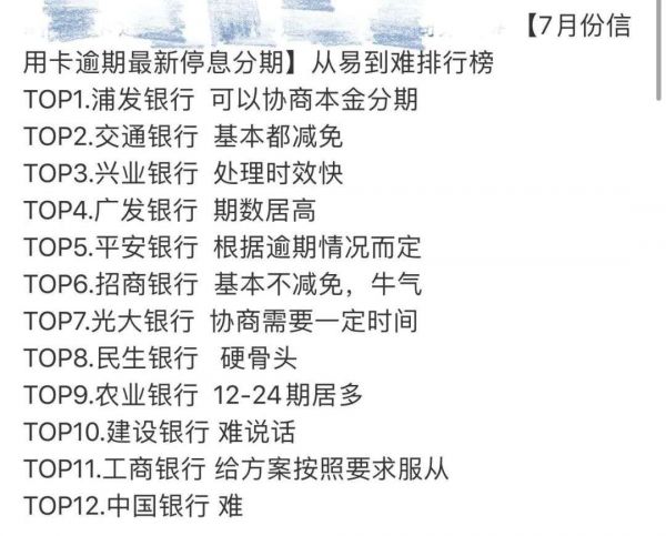 在某债务重组机构最新发布的一份7月信用卡逾期停息分期从难到易排行榜中,可以看到排名第一的是浦发银行,可以协商本金分期,排名十二的是中国银行,进行停息分期较难。