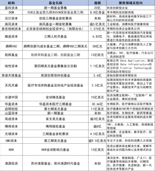 从投向领域看,科技创新领域和医疗健康最为吸引新募集基金关注。元璟资本、光速中国、博将资本、凯辉基金、盈科资本、DCM等及后均把科技创新作为重点关注领域。清源投资、山蓝资本、启明创投、华盖资本、天风天睿、凯辉基金、南风资本等将医疗健康列为新募集基金重点专注领域。