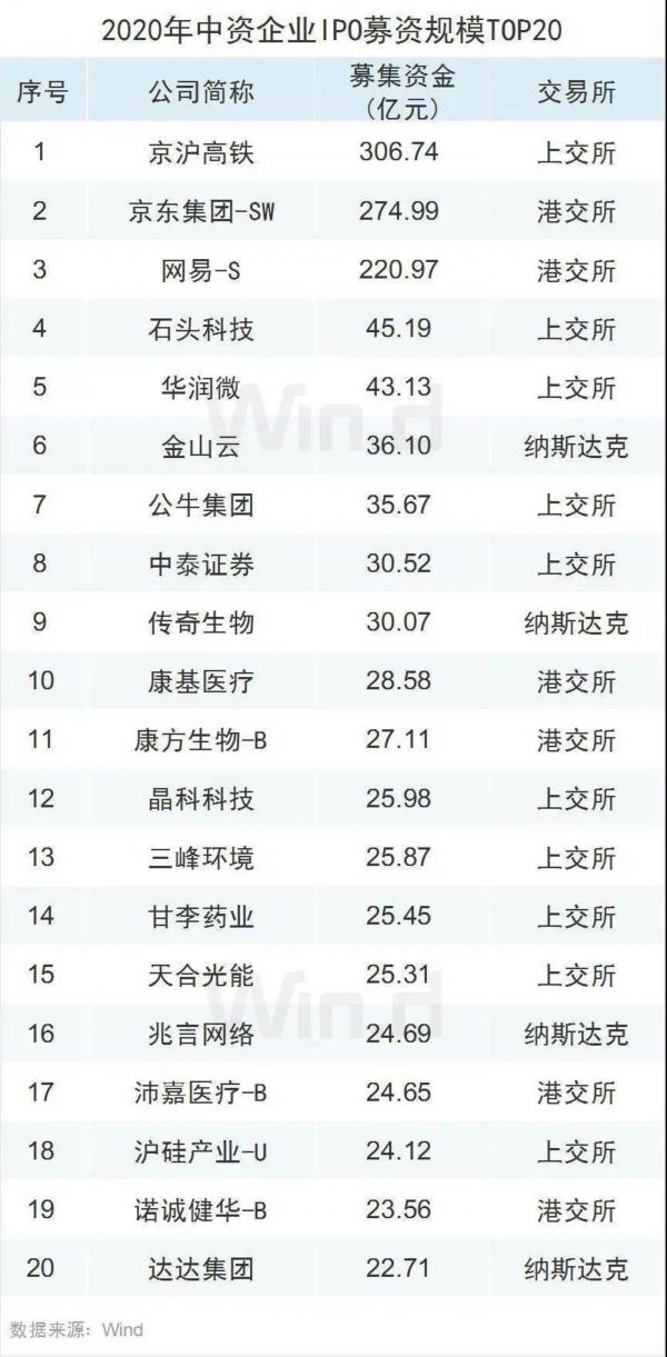 1月,京沪高铁在A股IPO,募集资金307亿元;6月,京东和网易在港股市场IPO,分别募集资金275亿元和221亿元。要知道,2019年整个一季度,所有中资企业在全球范围的IPO募资加起来,也只有385亿元。这已经不能用“创记录”来形容。