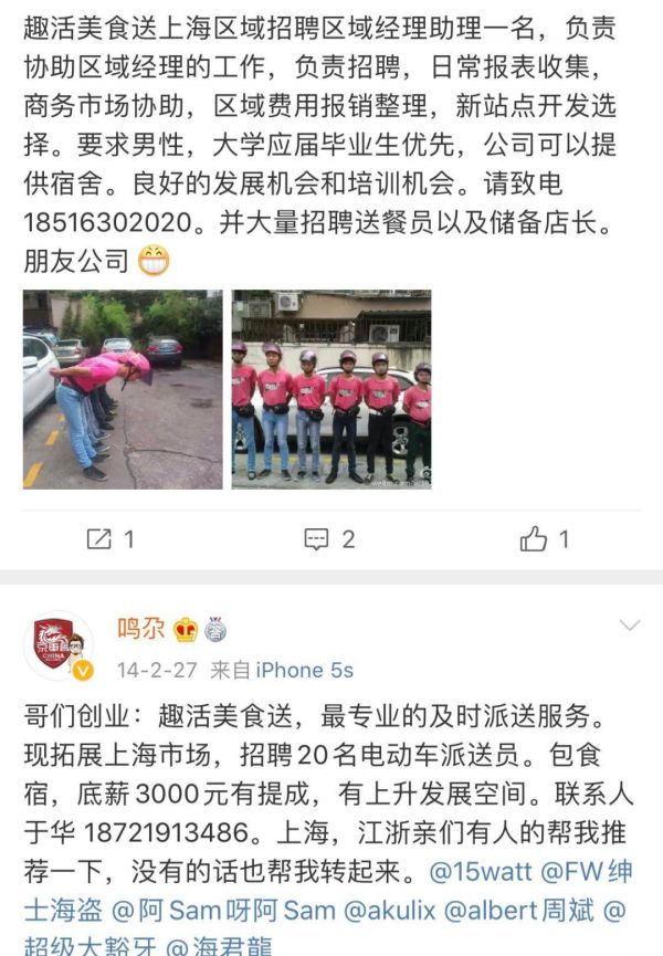 微博上关于趣活招聘骑手的最近一条信息来自2015年,也是一则帮“哥们”招聘的启事。