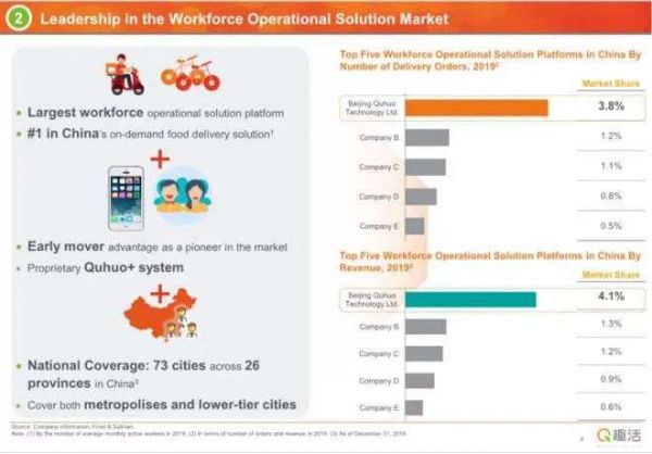 于是,他们共同成立趣活,一年后推出“趣活美食送”的服务。从名字就能看出,这公司一开始就直奔餐饮外卖而去。几年间,趣活已经成为一家“相当能打”的公司:招股书显示,就订单数量和营收来看,超过接下来三名市场参与者的总和。2019年,其营收达到20.56亿元。
