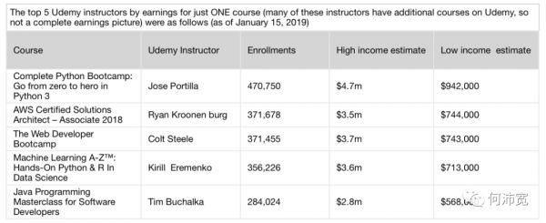 比如我们之前提到 Udemy Top5 课程的收入数据,范围在57万~470万美元之间。这些“明星”头部效应,为考虑是否进驻udemy平台的讲师,提供了高天花板的预期收入实例。