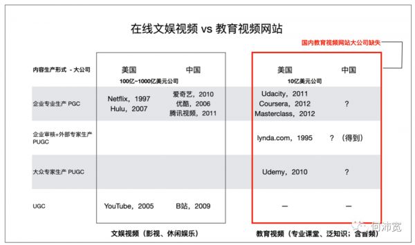 再后来,是C端消费视频的场景转移,从休闲文娱,到教育。这个转移发生在美国消费群体了,比如上面我们提到的Udemy,它成立于2010年,由大量C端消费者生产。这里说明一下,教育行业C端产出课程的创作者,需要一定专业技能,因此从课程、内容生产角度,C2C模式,创作者是大众用户里的专家,生产模式是PUGC。