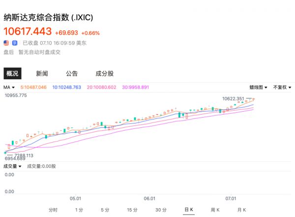 不过,这都不妨碍股市上涨。上周五,纳指收于 10617.443 点,再创历史新高。其中特斯拉股价首次突破 1500 美元,一周大涨近 28%。苹果、微软、亚马逊等科技巨头也创下收盘历史新高。