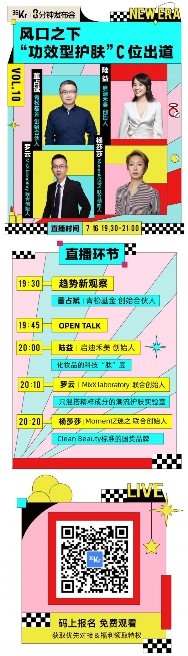 7月16日晚7点30分,青松基金创始合伙人董占斌坐镇,化妆品的科技“肽”度【启迪禾美】CEO陆益,潮流护肤实验室【MixX laboratory】联合创始人罗云,Clean Beauty标准的国货品牌【MomentZ迷之】联合创始人杨莎莎,将来到36氪8分钟发布会发布自己的创业项目。