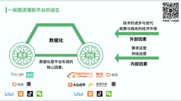 从阿里、Google、美团点评、B 站等平台的发展历程来看,最后成长为大平台的企业,都在不同的环境和条件下,显著提高了供需两端中至少一端的数据化程度。因为需求一般都跑在供给前面,大部分平台做的,是大幅提高供给的数据化程度。这是我们打造一个新平台或者说评估一个平台的价值时,可以去思考的一个角度。