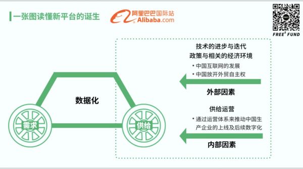 阿里巴巴在将中国中小生产厂家数字化的过程中,赶上了两个外部因素:中国放开外贸自主权、中国互联网的发展。
