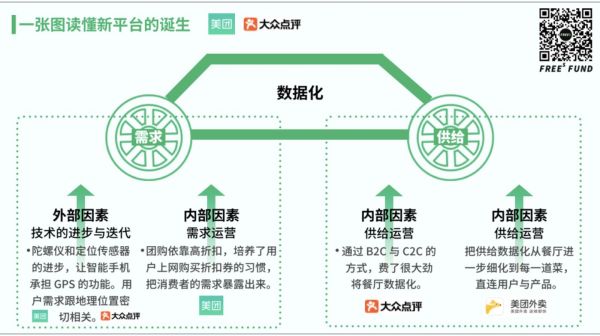 美团点评如今拥有万亿人民币市值。美团与大众点评各自发展、合并、一起做大的过程,说明了一个道理:只有供需两端同时完成了大规模的数据化,高效的供需关系匹配才得以可能,才有可能诞生新平台。