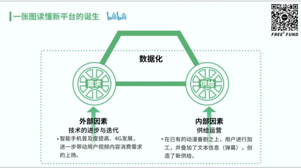当时,B 站跟优酷、土豆等在线视频网站采取的策略类似,把已经数据化的动画长片和动漫影像内容作为供给,放到自己的平台上。不过,B 站与其他内容平台不一样的地方在于,它在这类现成的供给之上,叠加了文本信息,也就是弹幕,这等同于创造了新的供给。当文本信息和数据化信息碰撞之后,产生了信息的交汇。这是 B 站的特色和文化,它也因此逐渐成长为一个二次元人群聚集的平台。