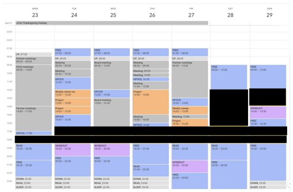 克利希南:通过你的日历,我发现一个比较有趣的地方,其中有许多开放时间段。我们之前也了解到,许多有影响力又有趣的人士,他们日常安排中也有类似的开放时间段。而在日程表中设置这种开放时间段,也与那些在日程表中从早上8点钟到晚上7点钟按半小时为单位这种极其紧凑的方法形成了鲜明的对比。