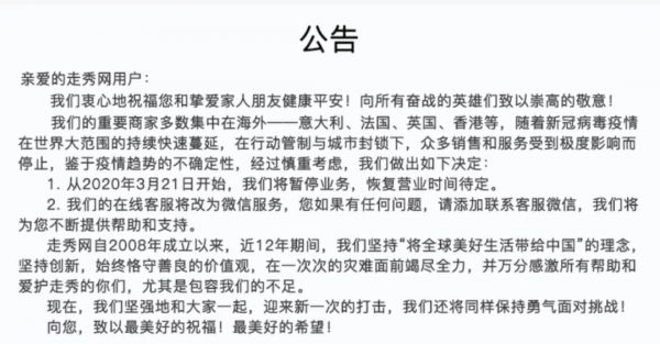 3 月 20 日,官网发布公告称,由于重要商家多数集中在海外,运营和服务受到极大影响,将从 3 月 21 日起暂停营业,恢复营业时间待定,并留有 4 名客服人员的微信二维码,来接待用户咨询。