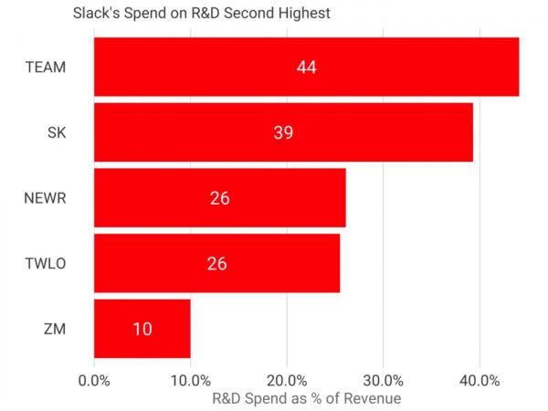 从数据看,Slack 把 39% 的收入花在研发上(1.56 亿美元),而 Zoom 则是 10%(3300万美元)。一个额外信息是,Zoom 雇佣了 1000 名员工,Slack 员工数 1500 人。