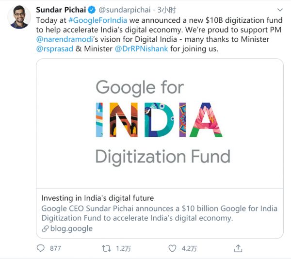 皮查伊在twitter上宣布Google For India设立基金的信息/Twitter