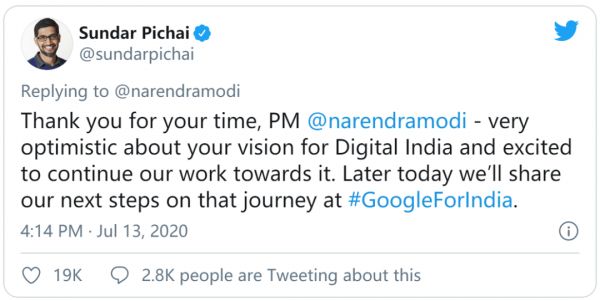 数小时后,桑德尔·皮查伊在Google For India大会中宣布,将在印度设立100亿美金的数字化基金。皮查伊说道:“我们为支持总理莫迪的数字印度愿景感到骄傲”。