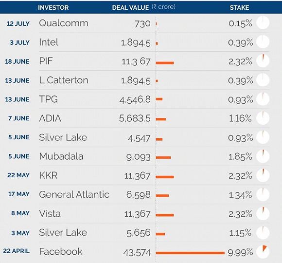 4月下旬以来,Jio Platforms获得的13笔融资/moneycontrol