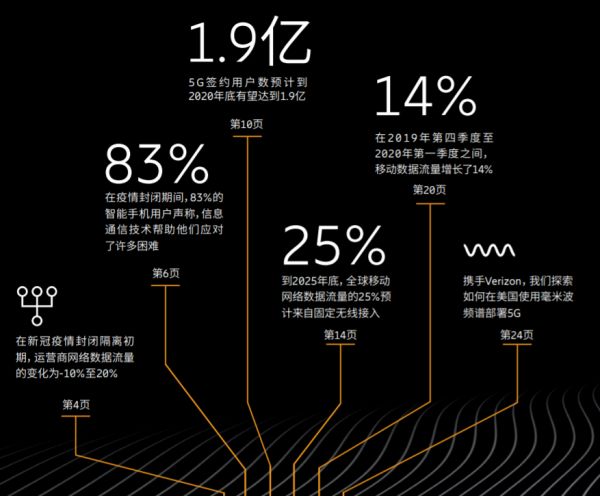据爱立信《移动市场报告》预测到2020年底,全球5G签约用户将突破1.9亿;到2025年底,该数字将达到28亿,届时5G将覆盖全球近65%的人口,45%的数据流量将由5G网络承载。疫情也突显了通信网络的关键作用。在全球范围内,疫情期间网络流量增加了20%-100%,语音话务增加了20%-70%,有83%的受访者认为信息通信技术帮助他们缓解了疫情隔离带来的问题,视频、教育、远程办公和医疗类APP使用量快速增长。