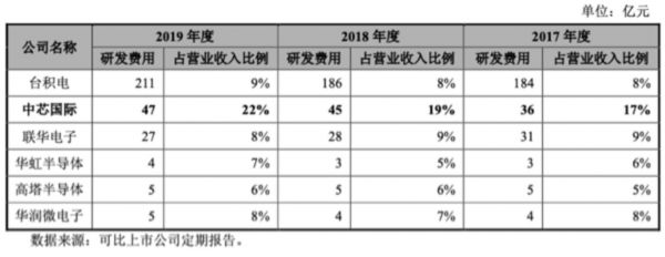 在研发投入上,中芯国际比较肯下本。在这次招股书显示的三项主要资金用途中,两项都与其技术进步和工艺提升有关。主流的晶圆代工商中,中芯的研发投入比例也是最高的,而且比例领先很多(台积电营收摆在那儿就不用比了)。
