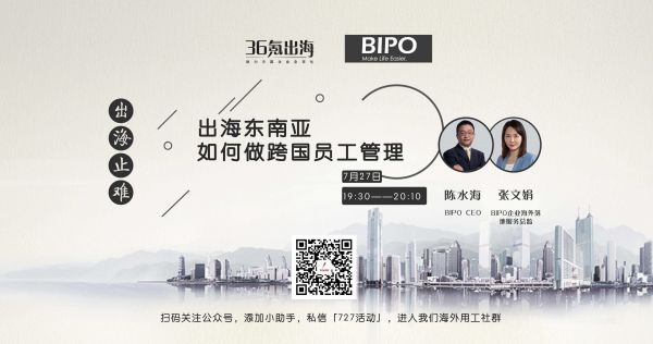 7月27日,我们将推出第三期「出海止难 | 海外用工」主题直播分享。本期直播我们邀请到了人力资源服务公司 BIPO CEO 陈水海先生及其企业海外落地服务总监张文娟女士,为我们带来“出海东南亚,如何做跨国员工管理”的分享与答疑。