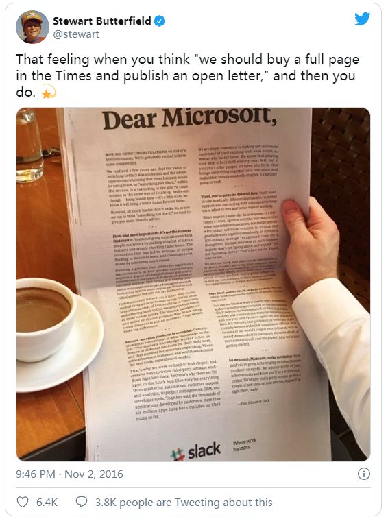 Slack CEO的推特:在《Times》用一整版广告给微软“道贺”