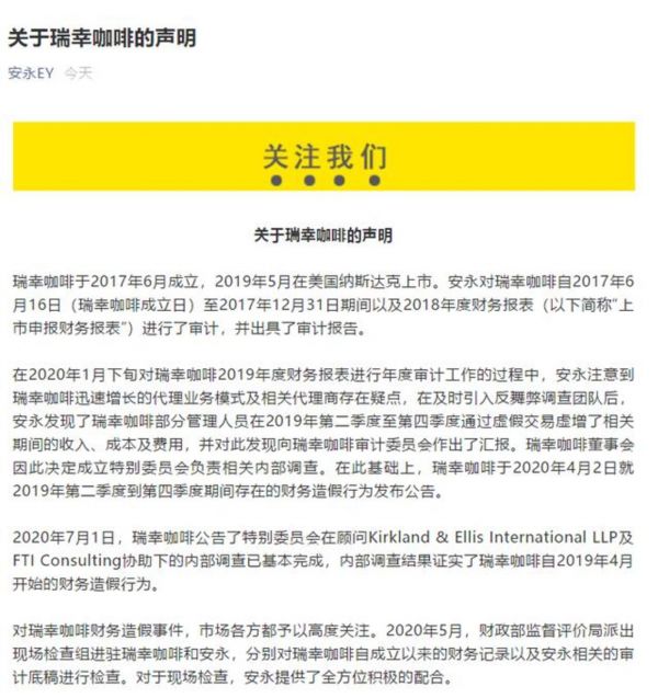 安永在声明中称,其在2020年1月下旬对瑞幸咖啡2019年财报进行年度审计工作的过程中,注意到瑞幸咖啡迅速增长的代理业务模式及相关代理商存在疑点,在及时引入反舞弊调查团队后,安永发现了瑞幸咖啡部分管理人员在2019年第二季度至第四季度通过虚假交易虚增了相关期间的收入、成本及费用,并对此发现向瑞幸咖啡审计委员会作出了汇报。