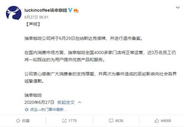 6月27日,瑞幸咖啡宣布公司两天后在纳斯达克停牌,并进行退市备案。国内的4000多家门店仍将正常运营。截至2020年6月30日,瑞幸咖啡初步的未经审计的现金和现金等价物(不包括限制性现金和非流动性短期投资)估计约为7.8亿美元。