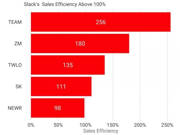 或许可以这样解释其中的差异:Zoom 偏向于外部病毒化传播,而 Slack 偏向内部。用 Zoom 开视频会议主要面向公司外部,而 Slack 的工作信息一般面向内部。一般来说,前者的转化系数更高,因此销售效率更高。