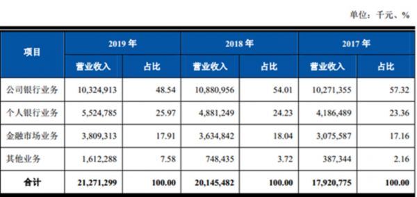 根据招股说明书的披露,2017年、2018年和2019年,上海农商行的公司银行业务营业收入分别为102.71亿元、108.81亿元和103.25亿元,占营业收入的比重分别为57.32%、54.01%和48.54%。