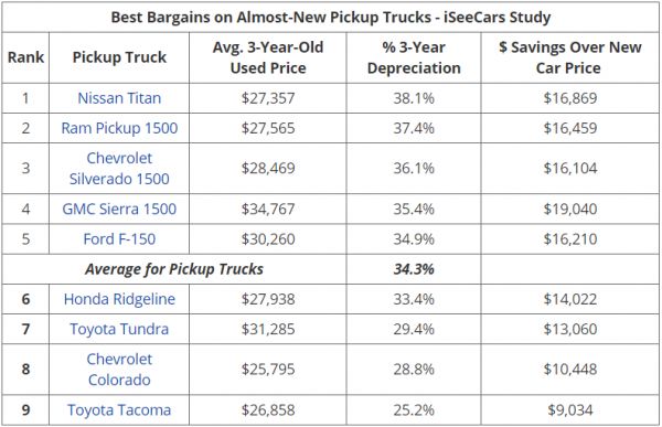 在皮卡车市场,平均三年折旧率为34.3%,iSeeCars发现五个轻型全尺寸皮卡的折旧率高于平均水平。