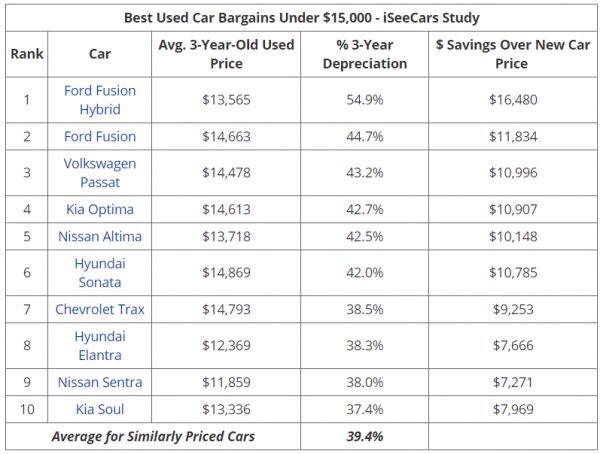 iSeeCars.com还调查了当前价格低于15000美元的汽车清单,该车型适合新驾驶员和毕业生选择。