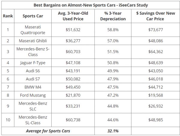 跑车的平均三年折旧率为32.1%,iSeeCars扩大了其分析范围,以研究销量低于总排名前十名的汽车,从而确定三年折旧最高的前十名跑车。
