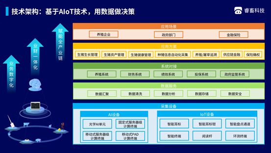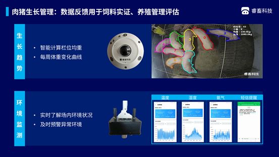 而睿畜科技通过传感器、物联网和计算机视觉技术搭建养殖数据基础设施,对猪场的生产数据进行智能化采集,将采集到的数据利用AI和大数据技术进行整合分析,实现对猪的生长、繁育情况的实时监控,及早预警疫病,及活体溯源与监管等。最终通过及时准确的数据,帮助养猪企业及时发现生产管理方面的问题,随时做出调整,降低人工成本,提高生产效率,避免损失的发生,同时还可帮助金融与政府机构实现养殖过程中的活体跟踪和监管。