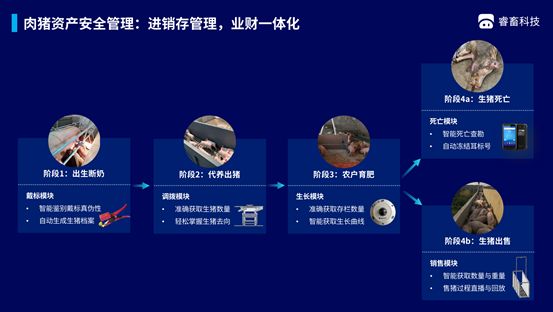 睿畜科技的资产管理系统通过物联网技术赋予每只活体唯一身份标识,并严格把控“进场、转场、出场”关键点,闭环业务数据的同时,也将业务数据与财务进行自动化的深度绑定。通过业财一体化,确保养猪企业的生物资产安全。
