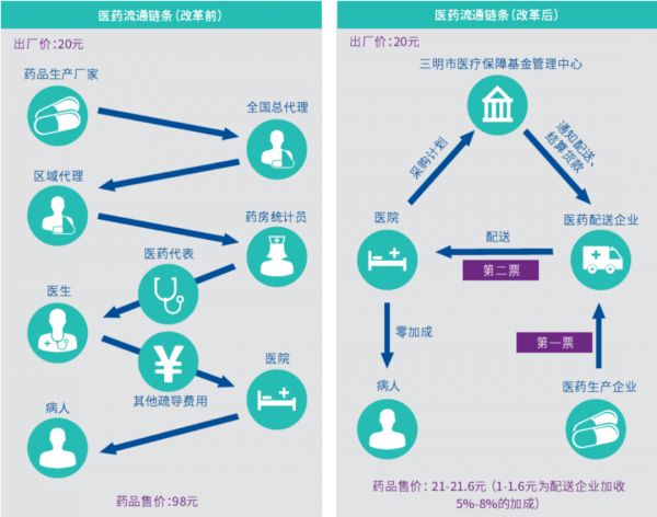 三明医改的经验开始在全国复制,2017年1月,国务院 《“十三五”深化医药卫生体制改革规划》提出,实施药品采购“两票制”改革:药品生产企业到流通企业开一次发票,流通企业到医疗机构再开一次发票。9个月后,全国所有省份均已制定实施两票制的时间表。
