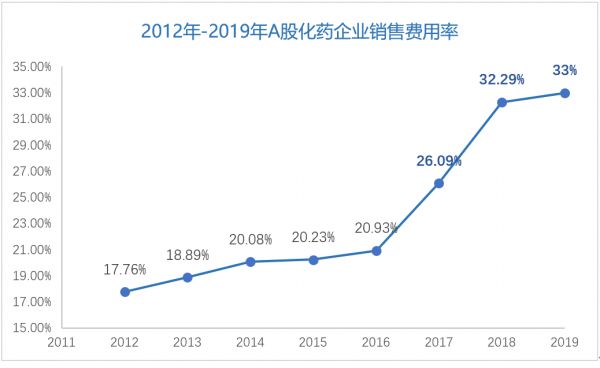 这一“转移”,在药企销售费用率上体现出来,因此制药工业普遍“增收不增利”。2012年-2016年间,A股制药板块的化药企业销售费用率稳定在20%左右,2018年提升至32.29%,相较于两票制全面推行前的2016年,提高了11.36%。
