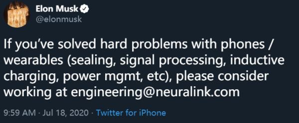 所以,马斯克也在推特上为自己的「人类进化梦想」招聘人才:「如果你解决过手机或可穿戴设备难题,包括密封、信号处理、感应充电、电源管理等,请考虑来 Neuralink 工作吧!」