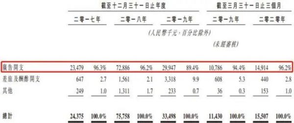 销售及分销开支为影响毛利的主要因素中,其中又以广告开支为主。2017-2020年一季度,稻草熊的广告开支占总开支的比例分别为96.3%、96.2%、89.4%以及96.2%,2019年广告开支下降主要是由于减少了10部剧集。