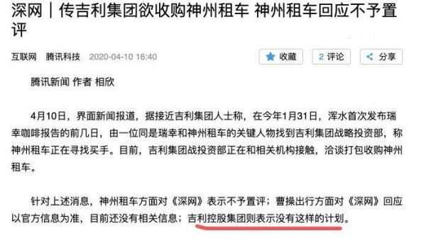 4月9日,一则“疫情冲击下的携程,正在洽谈收购神州租车”的消息被放出,对此携程方面很快就出来辟谣为假消息。而就在第二天,有媒体发布消息,称吉利集团正在洽谈收购神州租车,但同样的是,吉利也否认了这一消息。