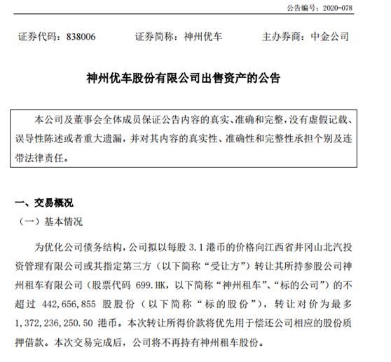 7月20日晚,神州优车发布公告表示,将以每股3.1港元的价格向江西井冈山北汽投资管理有限公司(下称北汽)及其指定的第三方转让其参股神州租车不超过4.43亿股股份。