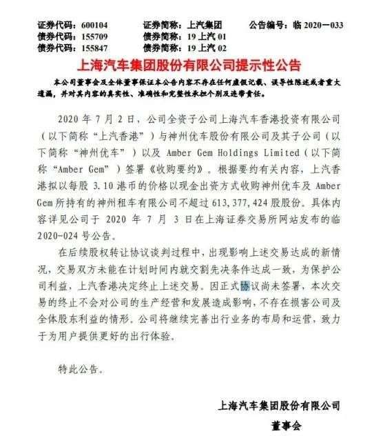 昨日,上汽集团发布公告称,终止之前与神州租车签署的收购协议,“双方未达成一致的先决条件,主要是关于神州租车未来运营方面。”上汽集团董事长陈虹在2020年股东大会上如此解释。