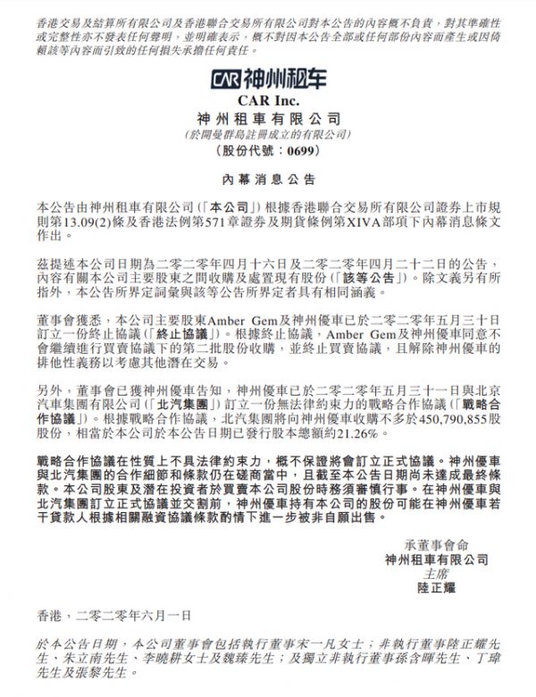 就在陆正耀为之感伤时,一个戏剧性的事情出现了,之前被“套路”的北汽重启了对神州租车的收购,随后神州优车的公告坐实了这一消息的真实性,在交易结束后,北汽将成为神州租车的最大股东。